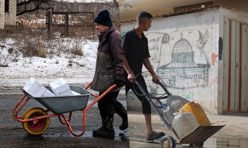 Savaşın etkisiyle Ukrayna ve Gazze'de yaşanan açlık ve su krizi, 16 Ekim Dünya Gıda Günü dolayısıyla Anadolu Ajansının benzer fotoğraflarının yer aldığı özel bir çalışmayla gündeme taşındı. 20 Şubat 2024’te Donetsk bölgesindeki Avdiyivka yakınlarındaki ağır bombardımana maruz kalan Ocheretyne köyünde insani yardım için uzun kuyruklar oluşmuştu (solda). 9 Temmuz 2025’te ise Gazze’nin orta kesimindeki Deyr Belah kentinde, yemek alabilmek için aralarında çocukların da bulunduğu çok sayıda Filistinli izdiham oluşturmuştu (sağda).