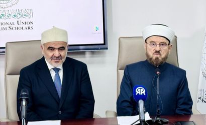Dünya Müslüman Alimler Birliği Başkanı Ali Muhyiddin el-Karadaği (sağda), Katar'ın başkenti Doha'da bulunan Dünya Müslüman Alimler Birliği Genel Merkezinde, Genel Sekreter Ali Muhammed Sallabi (solda) ile dünkü ziyarete ilişkin değerlendirmelerde bulundu.