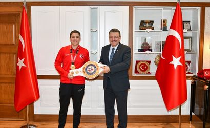 Sırbistan'da düzenlenen Kadınlar Dünya Boks Şampiyonası'nda altın madalya kazanan milli sporcu Busenaz Sürmeneli, Trabzon Büyükşehir Belediye Başkanı Ahmet Metin Genç'i makamında ziyaret etti.