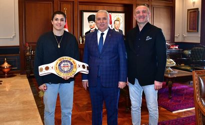 Dünya şampiyonu milli boksör Busenaz Sürmeneli, Sırbistan'da gerçekleştirilen Kadınlar Dünya Boks Şampiyonası'nda kazandığı altın madalya sonrası Trabzon Valisi Aziz Yıldırım'ı ziyaret etti.