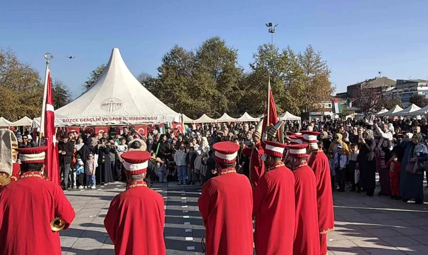 Düzce Belediyesi öncülüğünde, il genelindeki sivil toplum kuruluşlarının katılımıyla Anıtpark mevkiinde düzenlenen destek etkinliği yoğun ilgi gördü. Etkinlik, açılışta sahne alan mehteran takımının müzikleriyle başladı.