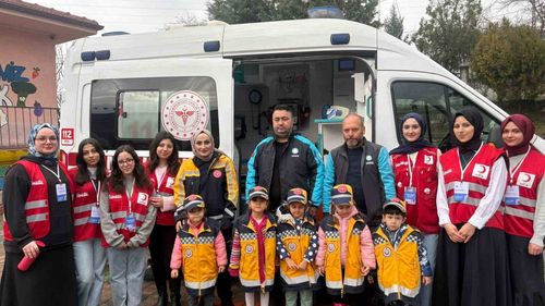 Düzce Esentepe İlkokulu'nda Kızılay Genç Gönüllüleri ve İl Sağlık Müdürlüğü iş birliğiyle 28 öğrenciye sağlık eğitimi, "Minik 112" uygulaması ve taramalar yapıldı.