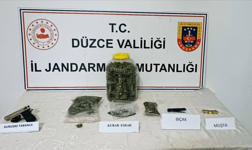 Yapılan aramalar sonucunda bidon içinde 1.013 gram esrar, 1 adet muşta, 1 adet kelebek bıçak ve 1 adet kurusıkı tabanca ele geçirildi.