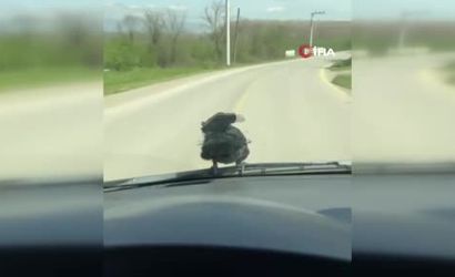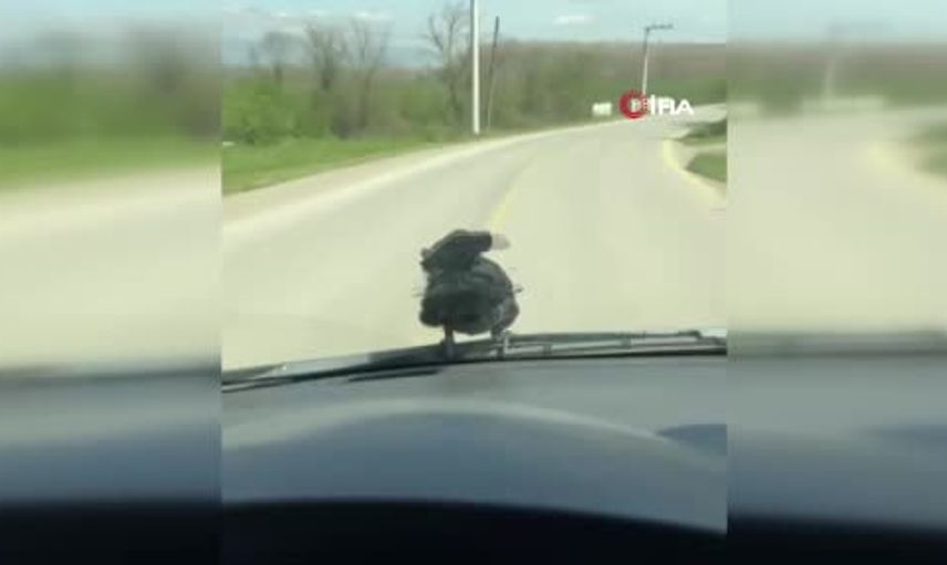 Seyir halindeki bir otomobilin ön cam sileceğine konan karga, araç hareket halindeyken yerinden ayrılmayıp silecek üzerinde uzun bir yolculuk yaptı. O anlar, sürücünün cep telefonu kamerasına yansıdı ve çevrede ilgi çekti.