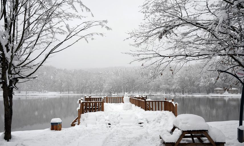 Düzce'nin Kaynaşlı ilçesinde kar yağışının ardından beyaza bürünen Korugöl Tabiat Parkı'nda güzel manzaralar oluştu.