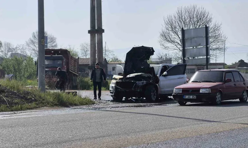 DÜZCE'DE SEYİR HALİNDEYKEN MOTOR KISMINDAN ALEV ALAN CİP KULLANILMAZ HALE GELDİ