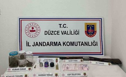 Yapılan aramalarda ele geçirilenler arasında 1 adet av tüfeği, 56 gram kubar esrar, 36 gram sentetik uyuşturucu hammaddesi, 16 gram kokain, 3 gram metamfetamin, 7 adet sentetik ecza hapı, 6 adet uyuşturucu madde kullanma aparatı, 2 adet hassas terazi, 1 adet bıçak ve 1 adet cep telefonu yer aldı.