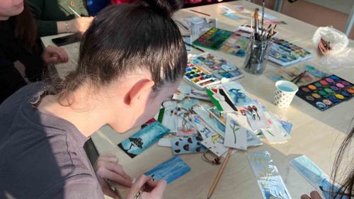 Düzce Üniversitesi öğrencileri, Gençlik Merkezi'nde düzenlenen sulu boya atölyesinde kendi kitap ayraçlarını yaparak sanatsal yeteneklerini geliştirdi.