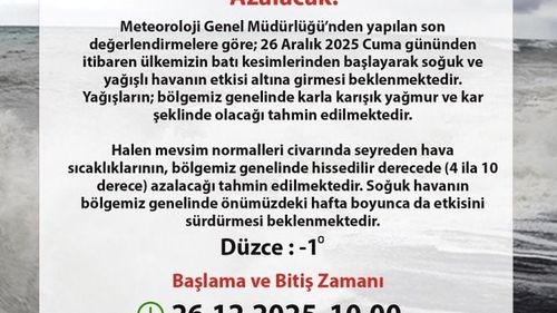 Düzce Valiliği, 26 Aralık 2025 Cuma'dan itibaren bir hafta boyunca bölge genelinde karla karışık yağmur ve kar beklendiğini bildirdi.