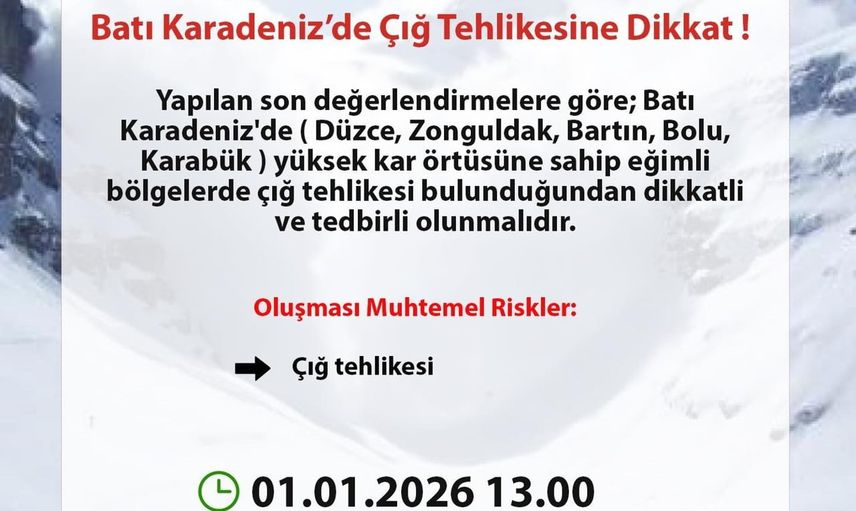 "Yapılan son değerlendirmelere göre Batı Karadeniz’de Düzce, Zonguldak, Bartın, Bolu ve Karabük illerinde yüksek kar örtüsüne sahip eğimli bölgelerde çığ tehlikesi bulunduğundan dikkatli ve tedbirli olunmalıdır" ifadesi duyuruda yer aldı.