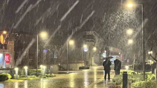Edirne'de akşam saatlerinde hızlanan kar yağışı, Selimiye Camii'nin siluetiyle birleşerek Selimiye Meydanı'nda izleyicilere eşsiz bir görsel sundu.