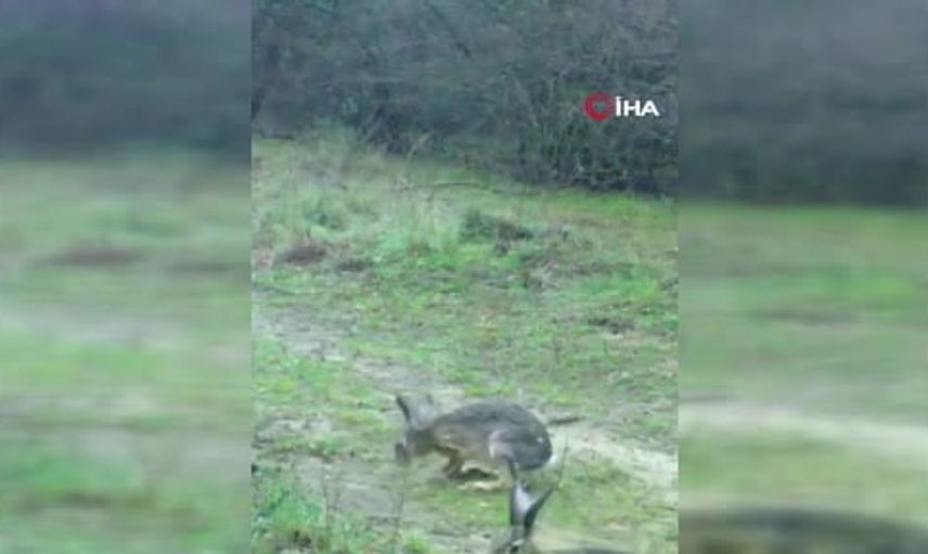 Edirne'de fotokapana yansıyan iki yaban tavşanı ilgi çekti