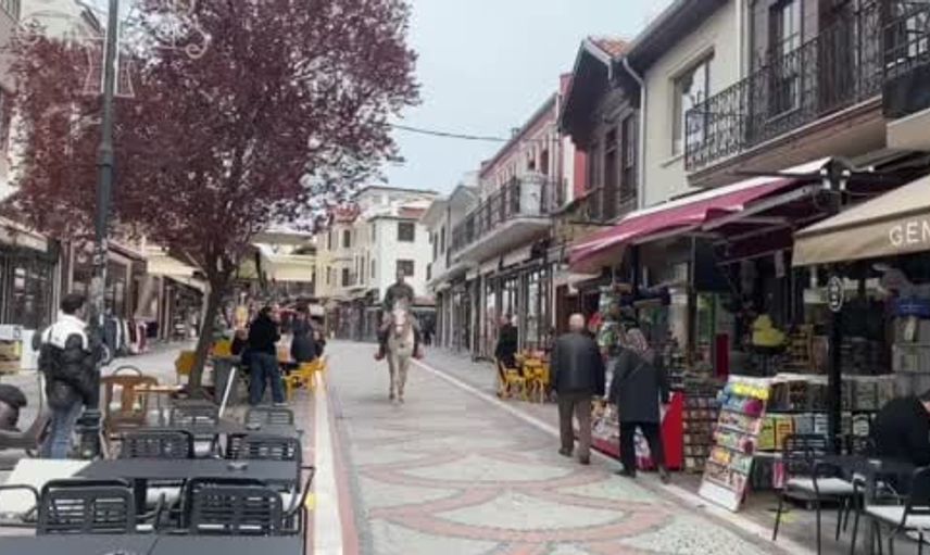EDİRNE’DE YAYA TRAFİĞİNİN YOĞUN OLDUĞU SARAÇLAR CADDESİNİ BEYAZ ATLA TURLAYAN BİR VATANDAŞ, İLGİNÇ GÖRÜNTÜ SERGİLEDİ.