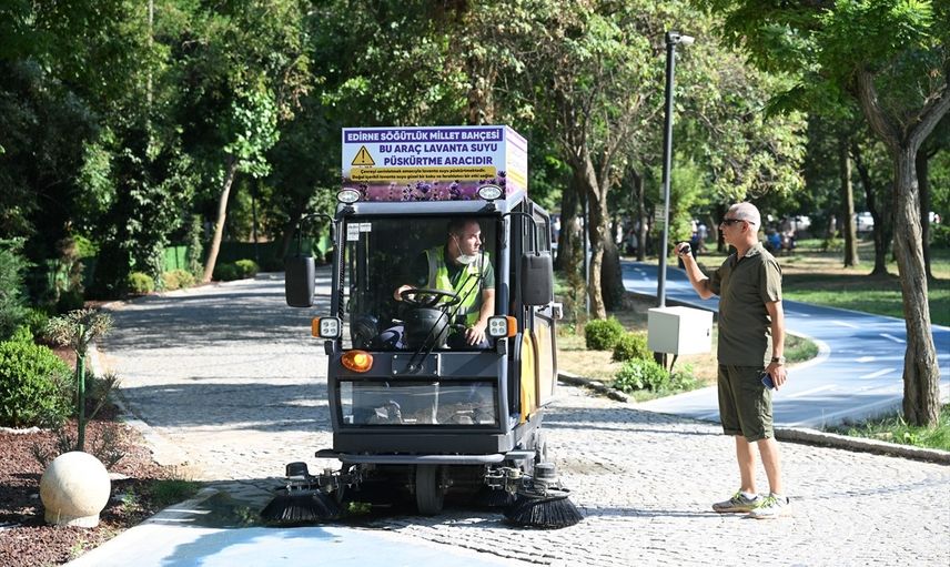 Edirne'de Söğütlük Millet Bahçesi'ne gelenler, lavanta suyu püskürten araçlar yardımıyla serinliyor.