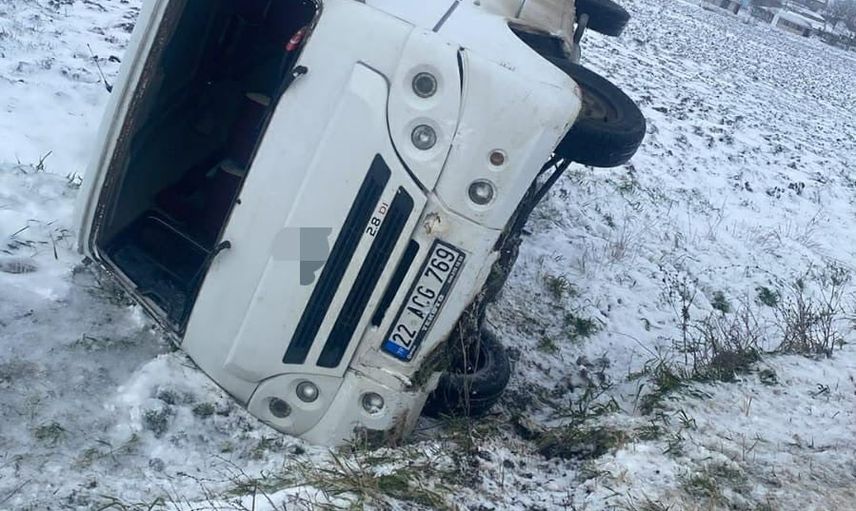 Edinilen bilgilere göre, İpsala ilçesinde İbriktepe-Hacıköy yolu üzerinde buzlanma nedeniyle kayganlaşan yolda sürücünün hakimiyeti kaybetmesi sonucu 22 ACG 769 plakalı minibüs kontrolden çıkarak tarlaya devrildi.