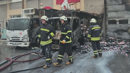 Tayakadın köyünde bir süt ürünleri firmasının deposu önünde park halindeki kamyonda çıkan yangın, yandaki araca sıçradı; 2 kamyon kullanılamaz hale geldi, depo zarar görmedi.