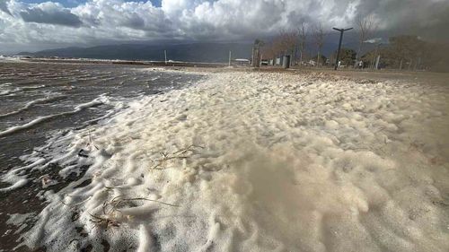 Edremit’te dün akşam etkili olan lodos, Altınkum Plajı’nı kilometrelerce deniz köpüğüyle kapladı; vatandaşlar şaşkınlıkla izledi, köpüğün organik maddelerin reaksiyonuyla oluştuğu tahmin ediliyor.