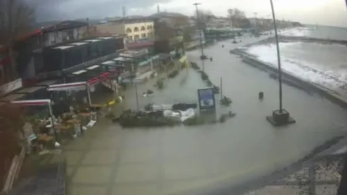 Balıkesir'in Edremit ilçesi Altınoluk'ta etkili lodos, rüzgar hızı 90 km/s'e ulaşınca sahil taştı; yürüyüş yolları ve turistik işletmeler sular altında kaldı.