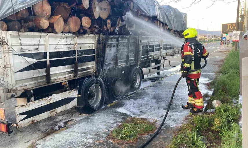 Balıkesir'in Edremit ilçesinde, E-87 karayolu Ra Otel mevkiinde seyir halindeki tomruk yüklü bir tırın dorsesinde yangın çıktı. Sürücünün aracı emniyet şeridine çekmesi ve itfaiyeye bildirmesi üzerine ekipler sevk edildi ve yangın söndürüldü.