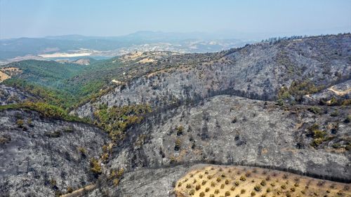 Ege'de meydana gelen orman yangınları, yeşil alanları etkileyerek grileşmesine neden oldu. Ekipler canla başla mücadele etti.