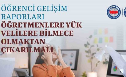 EĞİTİMCİLER BİRLİĞİ SENDİKASI (EĞİTİM-BİR-SEN), YAPTIĞI YAZILI AÇIKLAMADA, "TÜRKİYE YÜZYILI MAARİF MODELİ (TYMM) ÇERÇEVESİNDE İLKOKULLARDA BAŞLATILAN ‘ÖĞRENCİ GELİŞİM RAPORU’ UYGULAMASI, ÖĞRETMENLER ÜZERİNDE AĞIR VE BÜROKRATİK YÜK OLUŞTURMAKTA, ÖĞRENCİ GELİŞİMİNİ NET BİÇİMDE ORTAYA KOYAMAMAKTA, VELİLER İÇİN ANLAŞILIR BİR GERİ BİLDİRİM SUNMAKTAN ZİYADE ÇÖZÜLMESİ GEREKEN BİR BİLMECEYE DÖNÜŞMEKTEDİR" İFADELERİNE YER VERDİ.