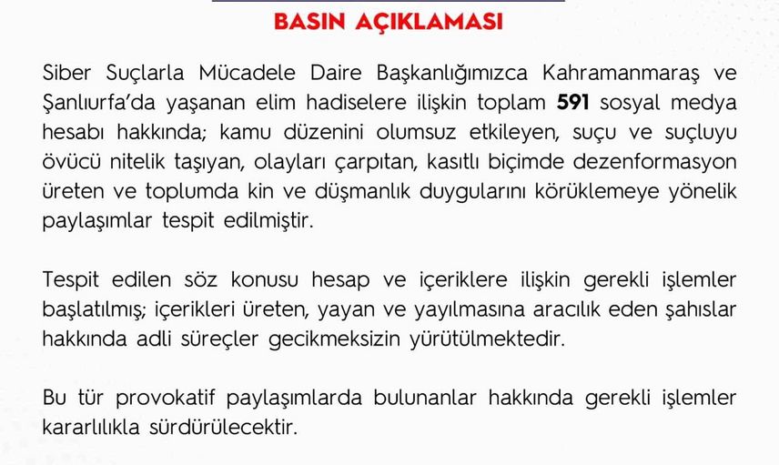 Emniyet Genel Müdürlüğü (EGM) tarafından yapılan açıklamada, Siber Suçlarla Mücadele Daire Başkanlığı'nın tespitlerine göre Kahramanmaraş ve Şanlıurfa'daki olaylarla ilgili toplam 591 sosyal medya hesabı hakkında işlem başlatıldığı bildirildi.