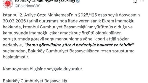 Bakırköy Cumhuriyet Başsavcılığı, Ekrem İmamoğlu hakkında yargı mensuplarına yönelik sözleri nedeniyle 'kamu görevlisine görevi nedeniyle hakaret ve tehdit' suçlarından resen soruşturma başlattı.
