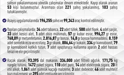 Bültende yer alan verilere göre kent genelinde toplam 1.034 asayiş olayı kaydedildi ve bu olaylarla bağlantılı olarak 946 şüpheli yakalandı. Yakalananlardan 47 kişi tutuklanırken, aranan 221 şahıstan 221'i yakalanmış olup bunlardan 103'ü tutuklandı.