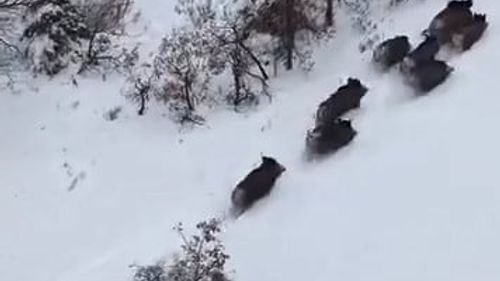 Elazığ'ın Ağın ilçesinde, Keban Baraj Gölü üst kısmındaki ağaçlık alanda karlar arasında gezen domuz sürüsü, vatandaşın dronuyla takip edilip gözden kayboldu.