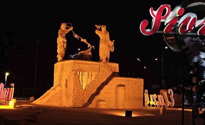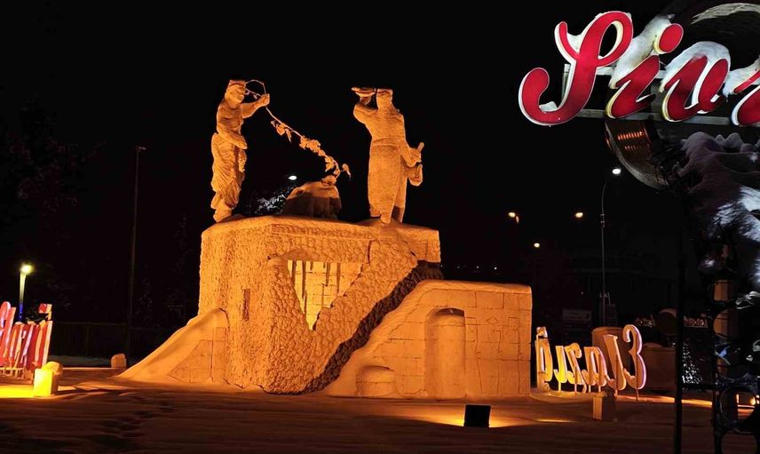 Kavşakta bulunan ve Elazığ’ın tüm ilçelerinin isimlerinin yer aldığı ile kentin simgesi olan Çaydaçıra efsanesini temsil eden heykel, kar altında farklı bir görünüm kazandı.