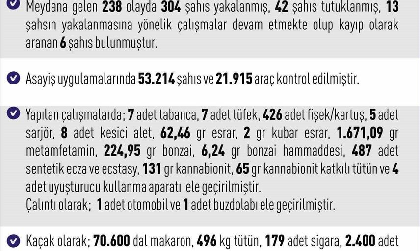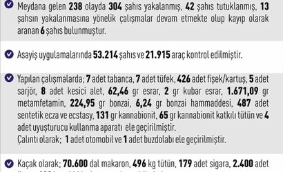 Operasyonlarda ele geçirilen suç unsurları ve miktarları şu şekilde kaydedildi: 7 adet tabanca, 7 adet tüfek, 426 adet fişek/kartuş, 5 adet şarjör, 8 adet kesici alet, 62,46 gram esrar, 2 gram kubar esrar, 1.671,09 gram metamfetamin, 224,95 gram bonzai, 6,24 gram bonzai hammaddesi, 487 adet sentetik ecza ve ecstasy, 131 gram kannabionit, 65 gram kannabionit katkılı tütün ve 4 adet uyuşturucu kullanma aparatı.