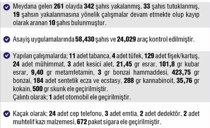 Yapılan çalışmalarda ele geçirilen malzemeler arasında şunlar yer aldı: 11 adet tabanca, 4 adet tüfek, 129 adet fişek/kartuş, 24 adet mühimmat, 3 adet kesici alet, 21,45 gram esrar, 101,8 gram kubar esrar, 9,40 gram metamfetamin, 3 gram bonzai hammaddesi, 423,75 gram bonzai, 184 adet sentetik ecza ve ecstasy, 288 gram kannabinoit, 35,76 gram kokain, 500 gram skunk. Ayrıca çalıntı olarak 1 adet otomobil ve kaçak olarak 24 adet cep telefonu, 3 adet emtia, 2 adet dedektör ve 2 adet muhtelif kazı malzemesi ele geçirildi.
