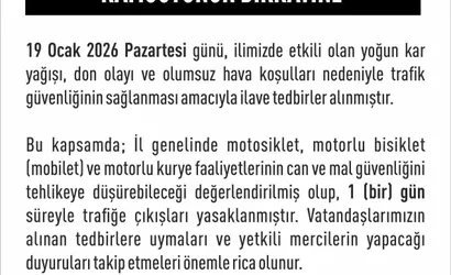 Açıklamada, 19 Ocak 2026 Pazartesi günü için motosiklet, motorlu bisiklet (mobilet) ve motorlu kurye faaliyetlerinin can ve mal güvenliğini tehlikeye düşürebileceği değerlendirilmiş olup, 1 (bir) gün süreyle trafiğe çıkışlarının yasaklandığı belirtildi.