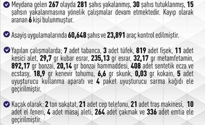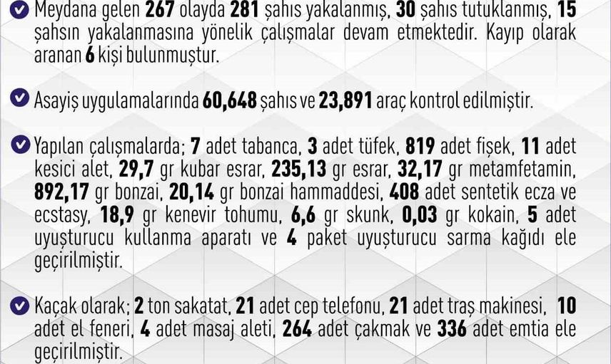 Yapılan çalışmalarda ele geçirilenler şu şekilde bildirildi: 7 adet tabanca, 3 adet tüfek, 819 adet fişek, 11 adet kesici alet, 29,7 gram kubar esrar, 235,13 gram esrar, 32,17 gram metamfetamin, 892,17 gram bonzai, 20,14 gram bonzai hammaddesi, 408 adet sentetik ecza ve ecstasy, 18,9 gram kenevir tohumu, 6,6 gram skunk, 0,03 gram kokain, 5 adet uyuşturucu kullanma aparatı ve 4 paket uyuşturucu sarma kağıdı.