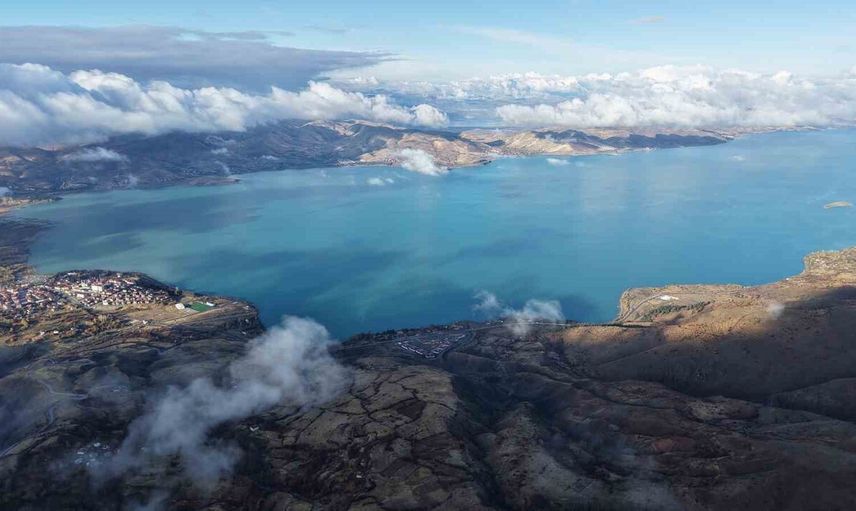 ELAZIĞ’DA KARLA KAPLI HAZARBABA DAĞI VE ETEĞİNDEKİ HAZAR GÖLÜ, BULUTLARLA BİRLİKTE KARTPOSTALLIK GÖRÜNTÜLER OLUŞTURDU