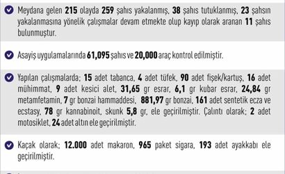 Yürütülen çalışmalarda 61.095 şahıs ve 20.000 araç kontrol edildi. Kontrol edilen araçlardan 2.969 adedine cezai işlem uygulanırken, 264 araç trafikten men edildi. Yakalanan şüphelilerden yaklaşık %15'i tutuklandı.