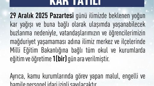 Elazığ Valiliği, 29 Aralık 2025 Pazartesi beklenen yoğun kar ve buzlanma nedeniyle merkez ve ilçelerdeki tüm MEB okullarında eğitime 1 gün ara verildiğini açıkladı.