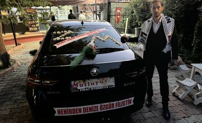 Gelin arabasının ön ve arka kısmına "Nehirden Denize Özgür Filistin" ve "Şehit Lider İsmail Heniyye'ye Selam Olsun" yazıları asıldı. Filistin bayrağı ile donatılan araç, düğün konvoyu eşliğinde şehir turu atan çift, sonrasında düğün salonuna ulaştı.
