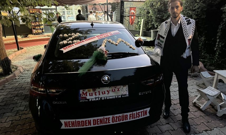 Elazığ'da Zeynep Avcı (22) ve Muhammed Nur Dalokay (25) çiftinin düğününde Filistin'e destek amacıyla gelin arabasına bayrak astı. Gelin arabası, bayrağın renklerini taşıyan çiçekler ve şeritlerle süslendi.