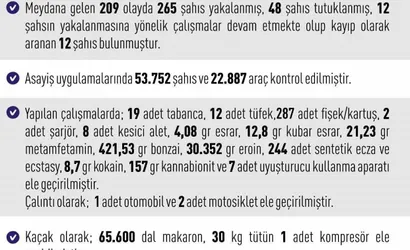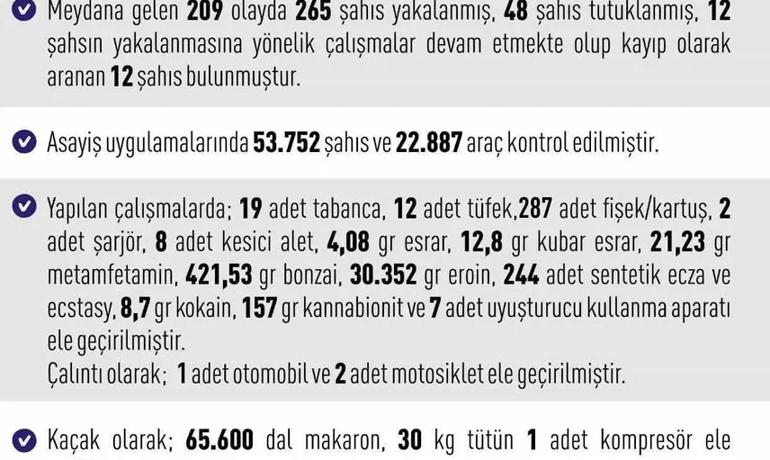 Bültende yer alan verilere göre gerçekleştirilen toplam 209 asayiş olayı neticesinde 265 şahıs yakalandı ve bu şahıslardan 48 kişi tutuklandı. Ayrıca yürütülen çalışmalarda kayıp olarak aranan 12 şahısın bulunduğu bildirildi.