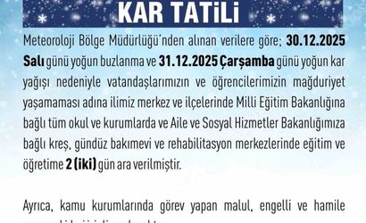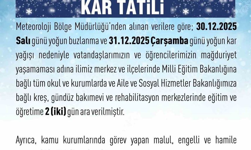 Valiliğin açıklamasında şu ifadelere yer verildi: "Meteoroloji Bölge Müdürlüğü’nden alınan verilere göre; 30.12.2025 Salı günü yoğun buzlanma ve 31.12.2025 Çarşamba günü yoğun kar yağışı nedeniyle vatandaşlarımızın ve öğrencilerimizin mağduriyet yaşamaması adına ilimiz merkez ve ilçelerinde Milli Eğitim Bakanlığına bağlı tüm okul ve kurumlarda ve Aile ve Sosyal Hizmetler Bakanlığımıza bağlı kreş, gündüz bakımevi ve rehabilitasyon merkezlerinde eğitim ve öğretime 2 (iki) gün ara verilmiştir. Ayrıca, kamu kurumlarında görev yapan malul, engelli ve hamile personel idari izinli sayılacaktır." Kapsam: Karar, Milli Eğitim Bakanlığına bağlı tüm okul ve kurumlar ile Aile ve Sosyal Hizmetler Bakanlığına bağlı kreş, gündüz bakımevi ve rehabilitasyon merkezlerini kapsamaktadır. ELAZIĞ VALİLİĞİ, YOĞUN BUZLANMA VE KAR YAĞIŞI NEDENİYLE İL GENELİNDE EĞİTİME 30 VE 31 ARALIK TARİHLERİNDE ARA VERİLDİĞİNİ DUYURDU
