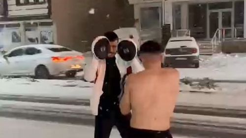 Elazığ’da milli boksör Yusuf Eren Yıldırım ve antrenörü Eyüphan Yıldırım, yağan kar altında önce antrenman yaptı, ardından arkadaşlarıyla birlikte kar banyosu gerçekleştirdi.