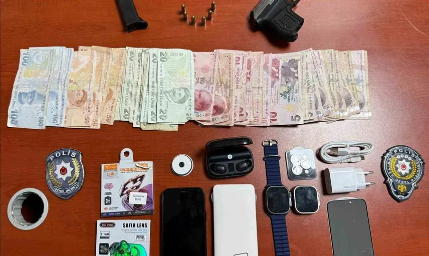 Ekipler tarafından yapılan üst aramasında; 1 adet ruhsatsız tabanca ve tabancaya ait 6 adet fişek, 1 adet akıllı cep telefonu, 1 adet banka kartı, 2 adet akıllı saat, 1 kablosuz kulaklık, powerbank, adaptör ve hırsızlık konusundan elde edildiği değerlendirilen 1.000 TL ele geçirildi.