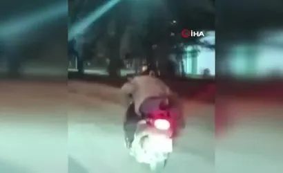 Motosikletin üzerine uzanarak seyreden şahıs canını hiçe saydı