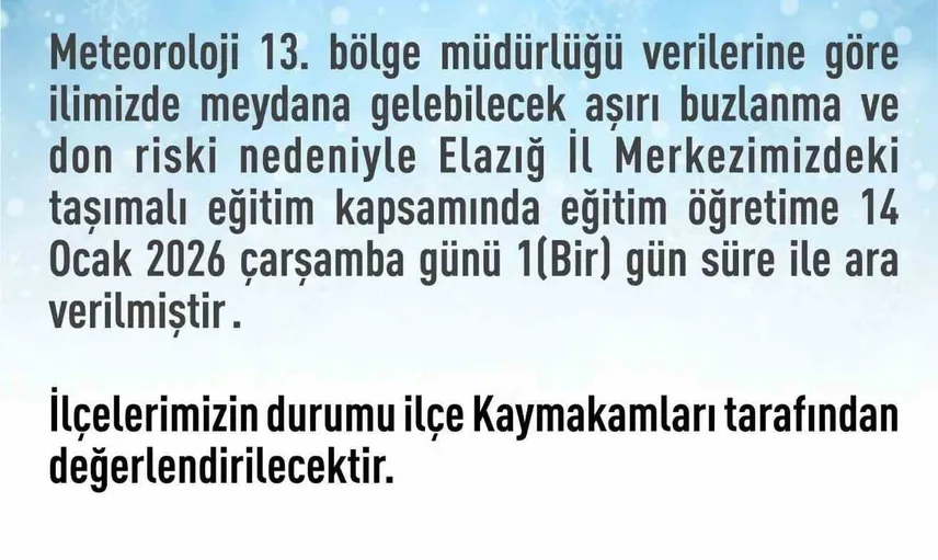 Valilik açıklamasında: "Meteoroloji 13. Bölge Müdürlüğü verilerine göre ilimizde meydana gelebilecek aşırı buzlanma ve don riski nedeniyle Elazığ il merkezimizdeki taşımalı eğitim kapsamında eğitim-öğretime 14 Ocak 2026 Çarşamba günü bir gün süre ile ara verilmiştir" denildi.