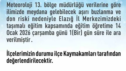 Don ve buzlanma riski nedeniyle Elazığ il merkezi ve 5 ilçede taşımalı eğitim 14 Ocak 2026 Çarşamba günü 1 gün süreyle durduruldu.