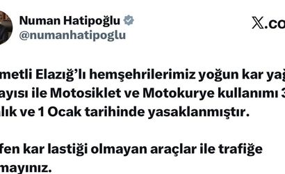 ELAZIĞ VALİSİ NUMAN HATİPOĞLU, YOĞUN KAR YAĞIŞI NEDENİYLE 31 ARALIK VE 1 OCAK TARİHLERİNDE MOTOSİKLET VE MOTOKURYE KULLANIMININ YASAKLANDIĞINI AÇIKLADI