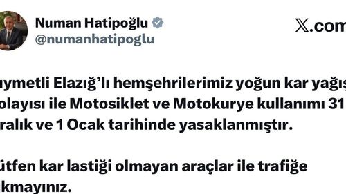 Elazığ'da motosiklet ve motokurye kullanımı yasaklandı Elazığ'da etkili olan yoğun kar yağışı nedeniyle 31 Aralık ve 1 Ocak tarihlerinde motosiklet ve motokurye kullanımının yasaklandığı bildirildi. Vali açıklaması Elazığ Valisi Numan Hatipoğlu, kentteki olumsuz hava koşulları sebebiyle bu tedbirin alındığını duyurdu.…