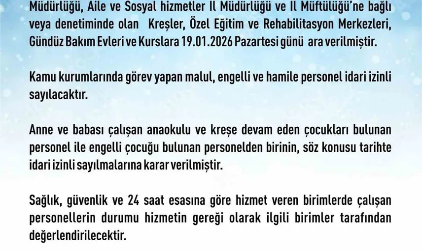 Valilik, kamu kurumlarında görev yapan malul, engelli ve hamile personelin idari izinli sayılacağını bildirdi. Ayrıca; anne ve babası çalışan ve anaokulu ya da kreşe devam eden çocukları bulunan personel ile engelli çocuğu bulunan personelden birinin söz konusu tarihte idari izinli sayılmasına karar verildi.