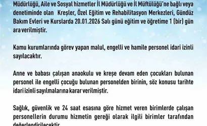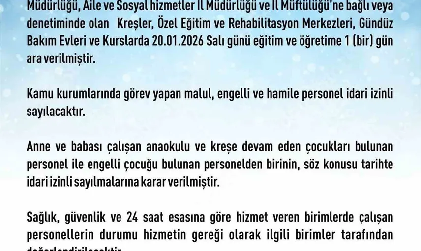 "Yoğun kar yağışı ve buzlanma nedeniyle ilimiz merkezinde Milli Eğitim Müdürlüğü, Aile ve Sosyal Hizmetler İl Müdürlüğü ve İl Müftülüğü’ne bağlı veya denetiminde olan kreşler, özel eğitim ve rehabilitasyon merkezleri, gündüz bakım evleri ve kurslarda salı günü eğitim ve öğretime 1 gün ara verilmiştir. Kamu kurumlarında görev yapan malul, engelli ve hamile personel idari izinli sayılacaktır. Anne ve babası çalışan anaokulu ve kreşe devam eden çocukları bulunan personel ile engelli çocuğu bulunan personelden birinin söz konusu tarihte idari izinli sayılmalarına karar verilmiştir. Sağlık, güvenlik ve 24 saat esasına göre hizmet veren birimlerde çalışan personellerin durumu hizmetin gereği olarak ilgili birimler tarafından değerlendirilecektir. İlçelerde ise kaymakamlar tarafından karar verilecektir."